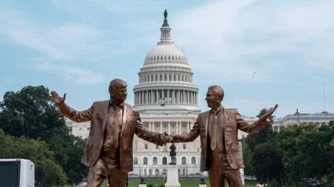 Trump y Epstein de la mano: instalan una polémica estatua frente al Capitolio de Estados Unidos