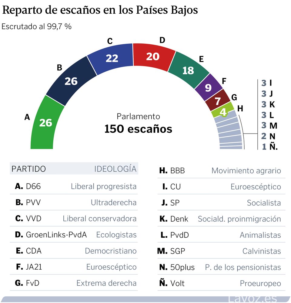 Las otras fuerzas de ultraderecha, el Foro de la Democracia (FvD) y JA21, compensan el descenso del 6,9 % del PVV con un aumento conjunto del 7,6 % A nivel de escaños, los once diputados perdidos por Wilders se contrarresta con los doce logrados por JA21 (pasa de uno a nueve) y FvD (de tres a siete). Parece que en los Países Bajos el apoyo al populismo ni se crea ni se destruye, se transforma.