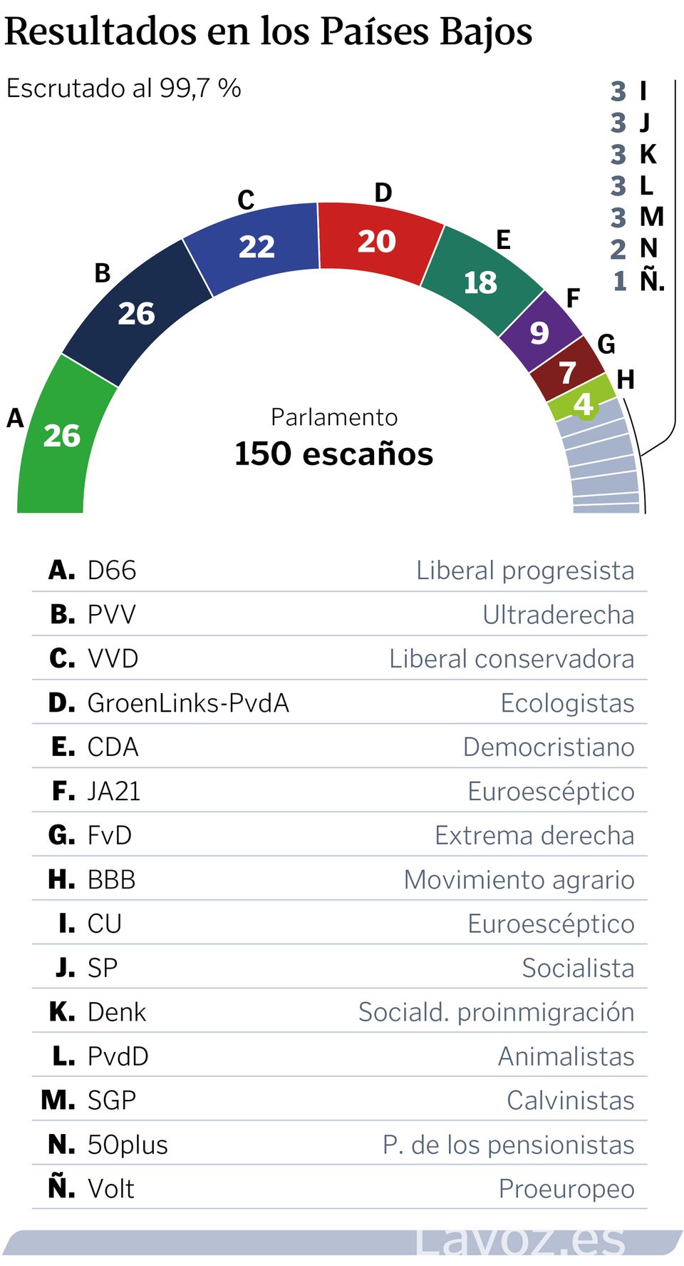 31 oct 2025 . Actualizado a las 05:00 h.El ultraderechista Partido por la Libertad (PVV) y los liberal progresistas D66 han obtenido el mismo número de diputados (26) en el nuevo Parlamento de los Países Bajos. Tras una emocionante noche electoral, el PVV de Geert Wilders pierde once escaños y el D66 gana diecisiete respecto a los comicios del 2023. La formación liberal progresista ha salido vencedora por primera vez en su historia, obteniendo su mejor resultado a nivel nacional, al pasar de nueve a 26 diputados. Se abre así el camino para que su líder, Rob Jetten, esté al frente una futura coalición de gobierno apoyada por socialdemócratas, democristianos y liberal conservadores.