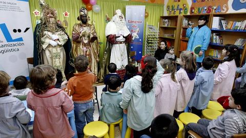 1 Los Reyes Magos le metieron ayer dos tantos a Papa Noel en Sober: el primero -por la escuadra- al adelantarse a Santa en la visita a los más pequeños del municipio, y el segundo, porque hablaban un perfecto gallego. La visita, eso sí, no era para traer regalos. En esta ocasión Melchor, Gaspar y Baltasar, traían las alforjas de sus camellos vacías. Viajaron a la Ribeira Sacra a recoger una por una las cartas en las que los alumnos del colegio Virxe do Carme les expresaban sus deseos. La iniciativa, bajo el lema «Lingua de Reis», formaba parte del programa municipal de actividades navideñas y estaba organizada en colaboración con el Servizo Galego de Normalización Lingüística.