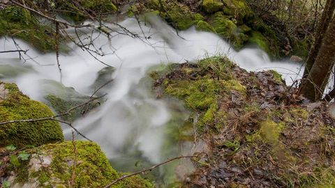 Habitualmente, en este paraje puede verse cómo brota del suelo una minúscula corriente que más abajo se incorpora al arroyo que pasa por el célebre bosque de la Devesa da Rogueira. Pero ese modesto hilo de agua -que aunque pequeño, fluye a lo largo de todo el año, incluso durante el estiaje- muestra ahora un aspecto mucho más imponente. Lo que normalmente puede considerarse como un simple manantial se ha convertido en un vigoroso arroyo, casi un pequeño río. La corriente se precipita montaña abajo causando un fuerte ruido que se puede percibir ya bastante antes de llegar a este lugar.