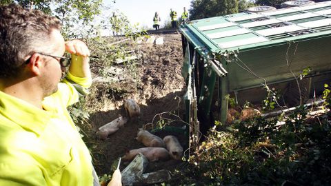 El accidente ocurrió poco antes de las diez de la mañana, cuando al camionero se le fue el vehículo a la derecha a la salida de una curva en un tramo en que la carretera pasa por encima del río Toldaos. El camión y el remolque que llevaba volcaron sobre su lateral derecho en el talud de la cuneta. No llegaron a caer en el agua, pero el golpe fue suficiente para romper la caja trasera. Por los agujeros que quedaron salieron buena parte de los cerdos que quedaron ilesos.