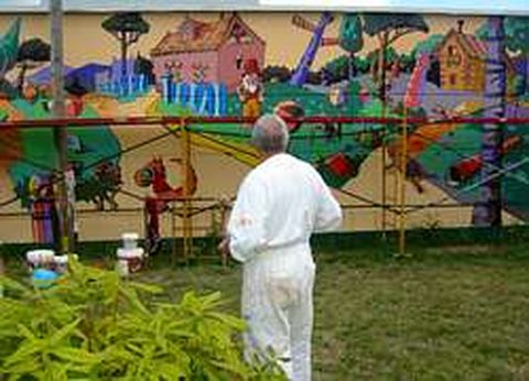 Reportaje | Nuevos espacios públicos en Vilalba El pintor e ilustrador vilalbés Eduardo Baamonde ultima la decoración de un mural, que se instala junto a un jardín creado por alumnos de educación infantil