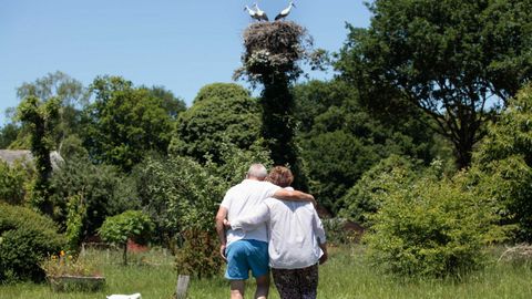 «Las cigüeñas ya son de casa», dice ella. Tanta familiaridad se basa en los años que las aves llevan acudiendo a su finca. Hace unos diez que su presencia es habitual, hasta el punto de que parte de la alimentación consiste en lo que ellos les dejan: compran unas xoubas o unas mollejas, las ponen en el jardín, y al poco aparecen las cigüeñas, que en estos años han tenido varias crías, para dar cuenta de lo que sus anfitriones les han comprado.