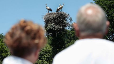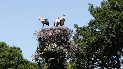 Los nidos de las cigüeñas están situados en los troncos de dos carballos. Unas mínimas atenciones a los árboles permiten, dice Enrique Rivadulla, que los troncos no se deterioren y sirvan año tras año para esta función. No hay duda de que dan por bien empleadas esas atenciones, porque son clara muestra de que están en el campo, pendientes de detalles como ver si las cigüeñas más jóvenes ya empiezan a volar. «Es una satifacción vivir en la naturaleza, ya lo creo. Estamos en la gloria», dice él.