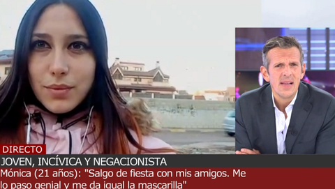 El mundo del negacionismo está sacando a la luz personajes impagables. Primero fue Miguel Bosé con sus vídeos paranoides el que quiso buscarle tres pies al gato de la pandemia como si el panorama no fuera ya lo suficientemente complicado. Ahora Cuatro ha descubierto el torpe testimonio de una chica que salió en pantalla decidida a convertirse en la Juana de Arco de una juventud subyugada por las mascarillas y los toques de queda, pero acabó convertida en icono nacional de la estulticia. Su postura es interesante, porque explica lo que seguramente piensan muchos de aquellos que a estas alturas siguen haciendo botellón indiscriminadamente y buscan la forma de burlar las normas como si estas no se hicieran por el bien común. Su tesis principal es que «los ciudadanos son marionetas con las que los políticos juegan a su antojo». Su determinación, imperturbable: «En una fiesta con mis amigos me voy a quitar la mascarilla y punto». «Voto por esa libertad que nos merecemos los jóvenes, nos merecemos alguna fiesta». Y luego, la lógica aplastante: «¿Qué pasa, que el coronavirus se levanta a las once de la noche y se acuesta a las seis de la mañana?».