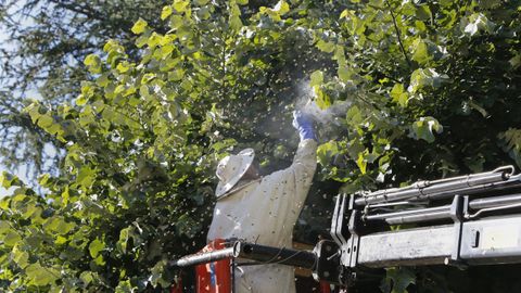 Llamo al 112, donde me explican que ellos no gestionan esto y que llame al 012; estos me dicen que solo retiran nidos de velutina, y que llame al Concello de Ames. Como está cerrado por las tardes, llamo a la policía local, que asegura que no tiene equipos ni competencias en el asunto, y que llame al 112. Me pongo en contacto con la policía autonómica, que también alega que no es su responsabilidad. Protección Civil, ídem. Me quedo como estaba.