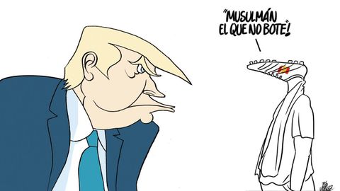 Guerra santa, pero psicolóxica, foi tamén a que libraron os miles de persoas que berraron «¡Musulmán el que no bote!» en Cornellá durante o amistoso entre as seleccións de España e Exipto. Eu vin as imaxes e comprobei que era xente nova. Mozos e mozas que rían, berraban e brincaban como posesos para lles comer a moral aos infieis. E conseguírono. Lamine Yamal —o único xogador musulmán que os entendeu— non deu unha en todo o partido e, enrabechado, chamoulles «racistas» e «ignorantes». O mesmo fixo a roxería toda. O meu amigo Fito, humorista gráfico sublime pero roxo impenitente, colgou na rede a viñeta que inclúo na ilustración deste artigo. Só Vox entendeu que aqueles monicreques saltareiros son querubíns de Trump que cantan a súa gloria.