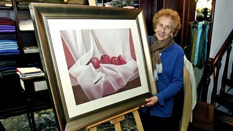 16 may 2013 . Actualizado a las 14:13 h.El último cuadro que ha pintado hasta la fecha la artista marinense Ánxeles Iglesias, de 87 años de edad, está expuesto estos días en la sastrería Acosta, en la calle Real de la localidad vecina. Se trata de un bodegón de gran tamaño, realizado a pastel, que la creadora ha realizado este mismo año y ex profeso con carácter solidario, a fin de ayudar a Cáritas en la lucha contra la pobreza. El futuro dueño de la obra puede hacerse con ella por nada más que dos euros, pero si la acción sale como espera, para la entidad benéfica puede suponer una inyección de nada menos que 2.000 euros para sus programas y servicios.