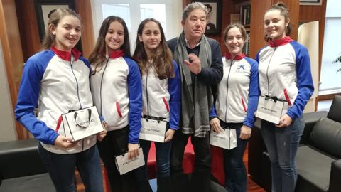 El alcalde de Pontevedra, Miguel Anxo Fernández Lores, recibió ayer en el Concello al equipo cadete de As Triscas, que acaba de proclamarse campeón gallego de gimnasia en la modalidad de mazas. Esta victoria le da a Marta, Carla, Paula, Lidia y Paula el pase directo a la prueba nacional. foto cedida