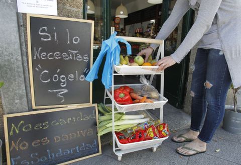 Así que dicho y hecho, hace solo dos días puso junto a la puerta de su tienda, en pleno Camiño de Fisterra, un carrito con varias bandejas en las que coloca cada día frutas, verduras y hortalizas, «todas frescas, no son las sobras del comercio, sino de lo mismo que los clientes vienen a comprar cada día». Junto al carrito dos carteles en los que puede leerse «si lo necesitas, cógelo» y una aclaración «no es caridad, no es dádiva, es solidaridad». Estos carteles serán traducidos en los próximos días al inglés «con la ayuda de un amigo», porque por delante de su comercio pasan muchos peregrinos y turistas extranjeros.