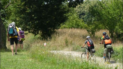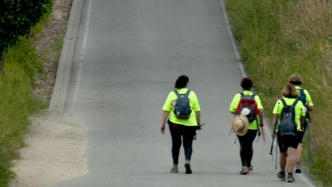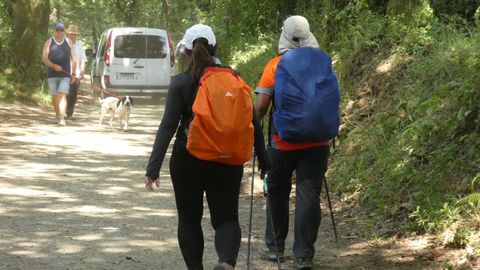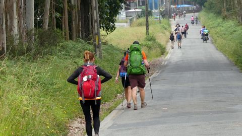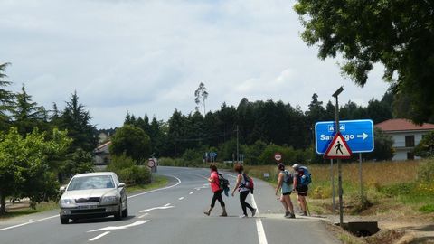 En O Pino, además de papeleras, destacan algunos paneles con el mapa del Camino. Innecesarios, desde luego, pero complementarios, y raro es quien no para ante ellos. Como raro es el que no se detiene ante un espacio indescriptible, ya cerca de Arca y donde suena ininterrumpidamente música clásica: anuncia un albergue. Pedrouzo, capital de O Pino, es un jolgorio constante en estos días. A la salida se encuentra el único punto donde no existe señalización (además del cruce, antes, de la incompleta autovía de Santiago a Lugo): al dejar atrás centros escolares y sociales, el Camino gira a la izquierda e inmediatamente se bifurca. Un grupo de alemanes duda, da marcha atrás, se acerca y pregunta al cronista mientras se contagian de la enfermedad actual de los caminantes: miran alarmados el GPS en sus móviles. Hay, cierto, dos pequeñas flechas amarillas pintadas en sendos árboles, pero tan diluidas por el tiempo que no impactan a primera vista.