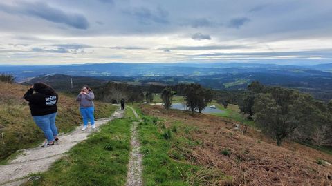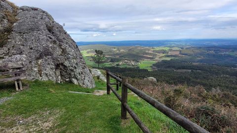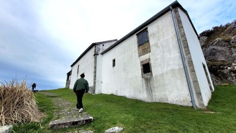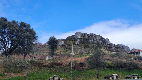 Así que a tres kilómetros de la hoy carretera general, que se abandona justo al pasar Lestedo (se llega arriba sin ningún problema, todos los cruces gozan de buena señalización), el visitante se encuentra en el amplio aparcamiento al pie de esa cumbre. Conste: poco antes del final arranca a la izquierda una pista de pendientes suaves que permite arribar al mismo sitio dando un agradable paseo. No es este tan solo un monte pelado con bloques graníticos a la vista, porque, para empezar, se levantó ahí mismo una iglesia que, sin duda, no fue fácil de construir. Está puesta bajo la advocación de San Sebastián, y, aunque sea prosaico decirlo, cerrada. Destaca su atrio, pequeño pero realmente bonito.