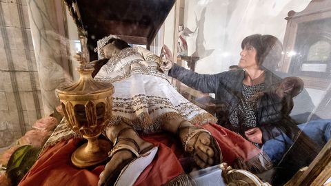 Otro de los rituales de la fiesta de la santa milagreira es adquirir un exvoto de cera para pedirle la sanación o agradecerle la curación de un mal vinculado a los huesos. «Os que máis levan son os de corpo enteiro», comenta María París, vecina de Negreira que empezó a ir a las fiestas a vender velas, velones y exvotos por las ferias cuando solo tenía 9 años. «A primeira vez que meu avó me deixou soa cun posto tiña 9 anos», comenta. Tras la retirada de su padre, María decidió asumir la gestión de la fábrica de velas, situada en Negreira: «Entre o Chamorro de Ferrol, pola Semana Santa, ata Santa Minia, fago unhas cen festas ao ano».