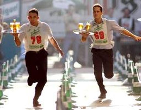El servicio rápido, sí señor. Esa es una de las cosas que se valoran en hostelería. Pero en Barcelona se lo han tomado a la tremenda. Cerca de un centenar de camareros han participado en la carrera anual de su gremio que no sólo exige velocidad, sino que después de recorrer los cien metros de rigor, las dos cañitas y el botellín de cerveza deben llegar lo más parecido a intactas. Como se ve en la imagen, los barman han puesto todo de su parte aunque seguro que alguna bandeja acabó de sombrero de los espectadores. No es disciplina olímpica, pero el concurso cada vez tiene más aceptación y con nueve temporadas ya se ha convertido en un clásico. Récord de «pilares» Otras competiciones que ya son clásicos son las de los récords Guinness y ayer se batió uno en España. Las castizas «pilares» desbancaros a las «shirleys». En total, 229 niñas y mujeres que se llaman María del Pilar se citaron en Madrid para batir el récord de personas con el mismo nombre que ostentaban las 122 mujeres llamadas Shirley que citaron en Australia. Puestos los cimientos de esta reunión, ahora sus organizadores quieren hacerlo cada año para revalidar su propia marca. ?arece que ayer la cosa fue de concentraciones porque varias ciudades celebraban el Día de la Lactancia con reuniones de madres y sus bebés. Santiago fue una de las ciudades que siguió la iniciativa. Una decena de mujeres dieron de mamar a sus hijos al mediodía en la praza do Toural para incitar a las madres a dar el pecho a sus bebés. Esta campaña, organizada por Unicef y la Alianza Mundial para la Acción por la Lactación, pretende concienciar a las mujeres de las saludables ventajas que tiene la lactancia materna, ya que reduce el riesgo de cáncer de mama y osteoporosis, entre otras ventajas tanto para las madres como para sus hijos. El presidente de Unicef Galicia, el médico compostelano Ramón Medina, afirmó que «la mujer que da el pecho a su hijo está haciéndose un favor a sí misma, además de a su hijo». Mariah siempre sorprende Hace tiempo que no se veía a Mariah Carey. Dice que está centrada en escribir su autobiografía y lo que salta a la vista es que no tiene nada que ocultar. La chica no deja de sorprender con sus exuberancias, escotes y minifaldas. Su más reciente aparición fue en la presentación de la colección de la diseñadora Donatella Versace, en Milán. Por cierto, la colección de la hermanísima recupera los aterradores drapeados que hacen ancha a la mismísima Linda Evangelista. No fue precisamente glamur lo que derrocharon.