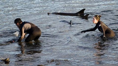 A las 15 horas, poco después de la bajamar, la situación era crítica. Algunos animales estaban en la orilla, casi sobre la arena. Varios transeúntes bajaron para intentar devolverlos al agua. Poco después llegaron buceadores de la Sociedade Galega de Historia Natural (SGHN), una lancha de Protección Civil y equipos de tierra de la Consellería de Medio Ambiente.