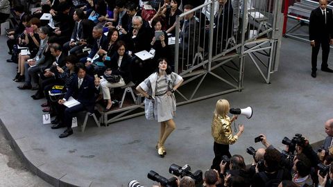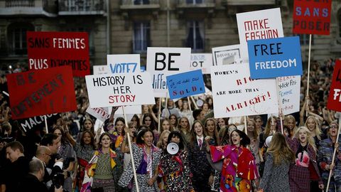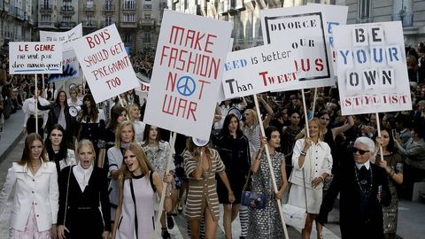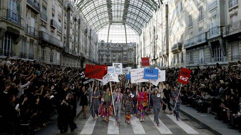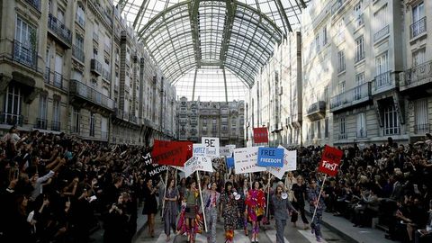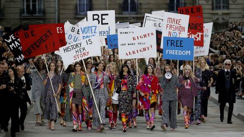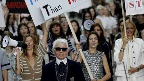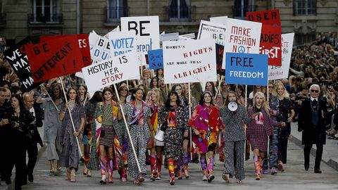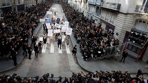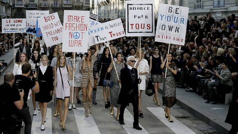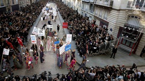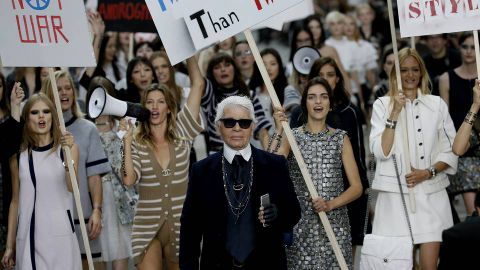 La aportación de Lagerfeld a este debate se materializó en un desfile que concluyó con la representación de una manifestación en que las modelos portaron megáfonos y pancartas.