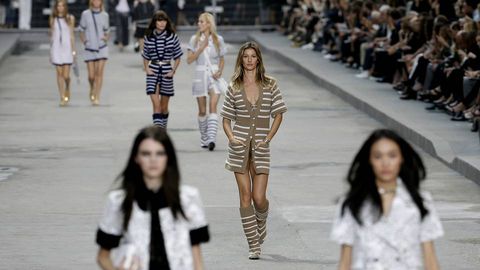 La supermodelo brasileña Gisele Bündchen sorprendió con su aparición sobre la pasarela de Chanel, en la que portó una chaqueta-vestido de rayas blancas y marrones.