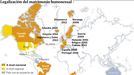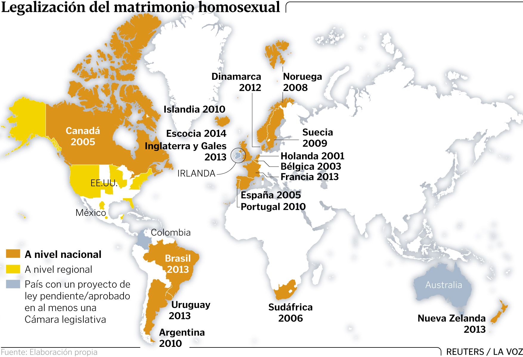 En Sudamérica rompió el hielo Argentina en el 2010 con una ley muy debatida. El mismo año, se sumó Portugal. Dinamarca rubricó en el 2012 su adhesión, y un año después Francia, Inglaterra, Uruguay, Brasil y Nueva Zelanda, junto con Escocia en el 2014 -e Irlanda este mes- fueron las últimas incorporaciones a los países en los que casarse dos hombres o dos mujeres no es ni delito ni los convierte en ciudadanos de segunda.
