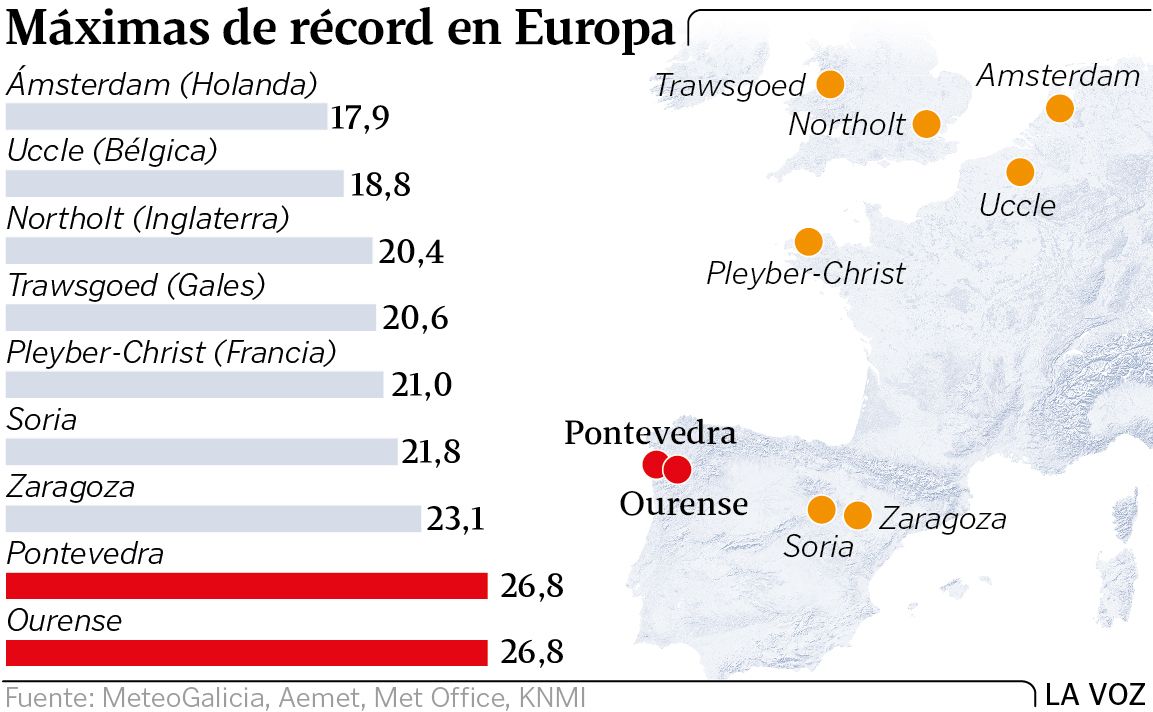 En España, tres estaciones alcanzaron cifras inéditas. Soria, con 21,8 y Zaragoza con 23,1. Pero el récord más notable en la Península se dio en Galicia. Ayer, la estación de Ourense de la Aemet marcó 25,4 grados, superando el valor histórico del domingo. En la estación de MeteoGalicia fue incluso más alta, con 26,8. En la comunidad gallega se están dando las temperaturas más elevadas de la Europa continental. Únicamente en Canarias fueron superiores. «Probablemente tenga que ver con que el eje de la dorsal térmica está próxima a Galicia. Dicho de otra forma, con la posición de la parte más cálida de la masa de aire de origen tropical que nos está afectando y que da lugar a valores más altos de las temperaturas en el noroeste de la Península que en otras zonas», explica Francisco Infante, delegado de la Agencia Estatal de Meteorología en Galicia.