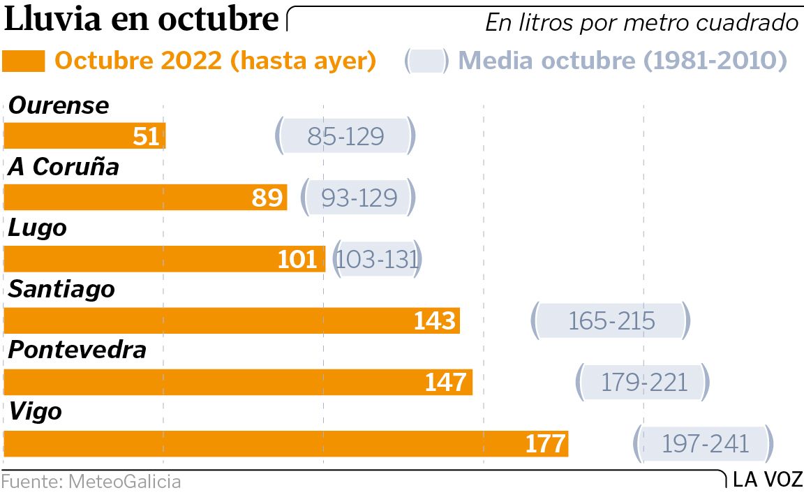 Las precipitaciones de los últimos diez días asociadas a las borrascas Armand y Béatrice han vuelto a ofrecer un retrato sobre cómo se reparte históricamente la lluvia en Galicia. Un debate que está más que superado, pero que en épocas de sequía viene bien recordar para no olvidar quiénes somos. Vigo lidera la cantidad de agua acumulada hasta hoy. Le sigue muy de cerca Pontevedra. Santiago cierra el podio.