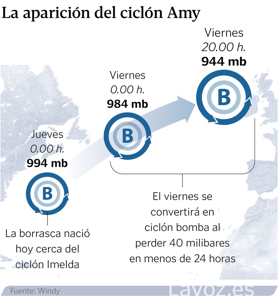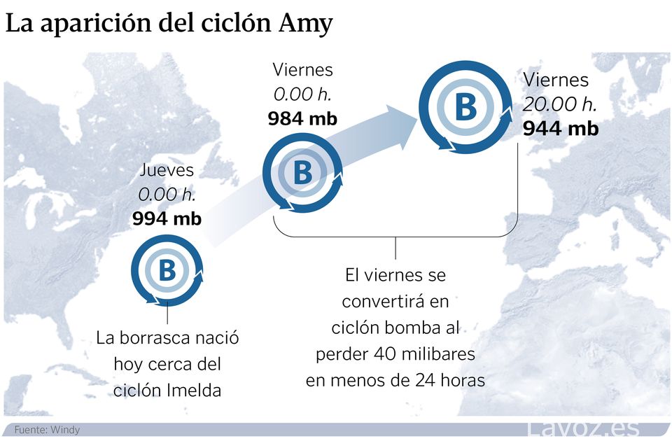 La borrasca explosiva que impactará con fuerza en Irlanda y que ha sido bautizada como Amy por la Agencia Meteorológica del Reino Unido podría haber afectado con intensidad en Galicia, sino fuera por la protección actual que ejerce la barrera anticiclónica. «En Galicia no nos veremos apenas afectados ya que el anticiclón que tenemos entre Azores y la Península provoca que esa borrasca se mueva muy al norte de Galicia. Sí notaremos un cambio de tiempo, con más nubes, menos temperatura y quizá algunas lluvias el sábado, pero nada muy significativo», concluye Taboada.