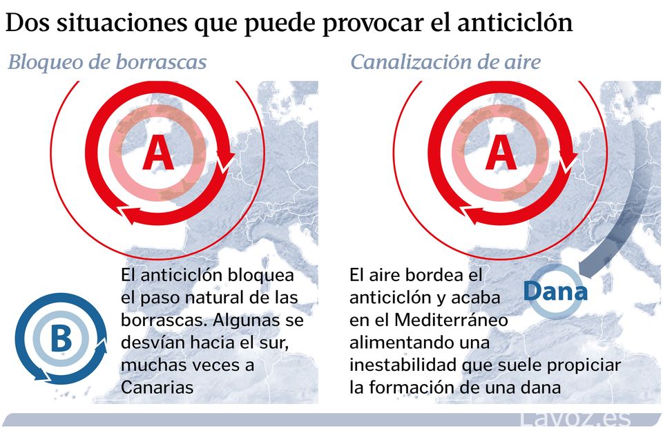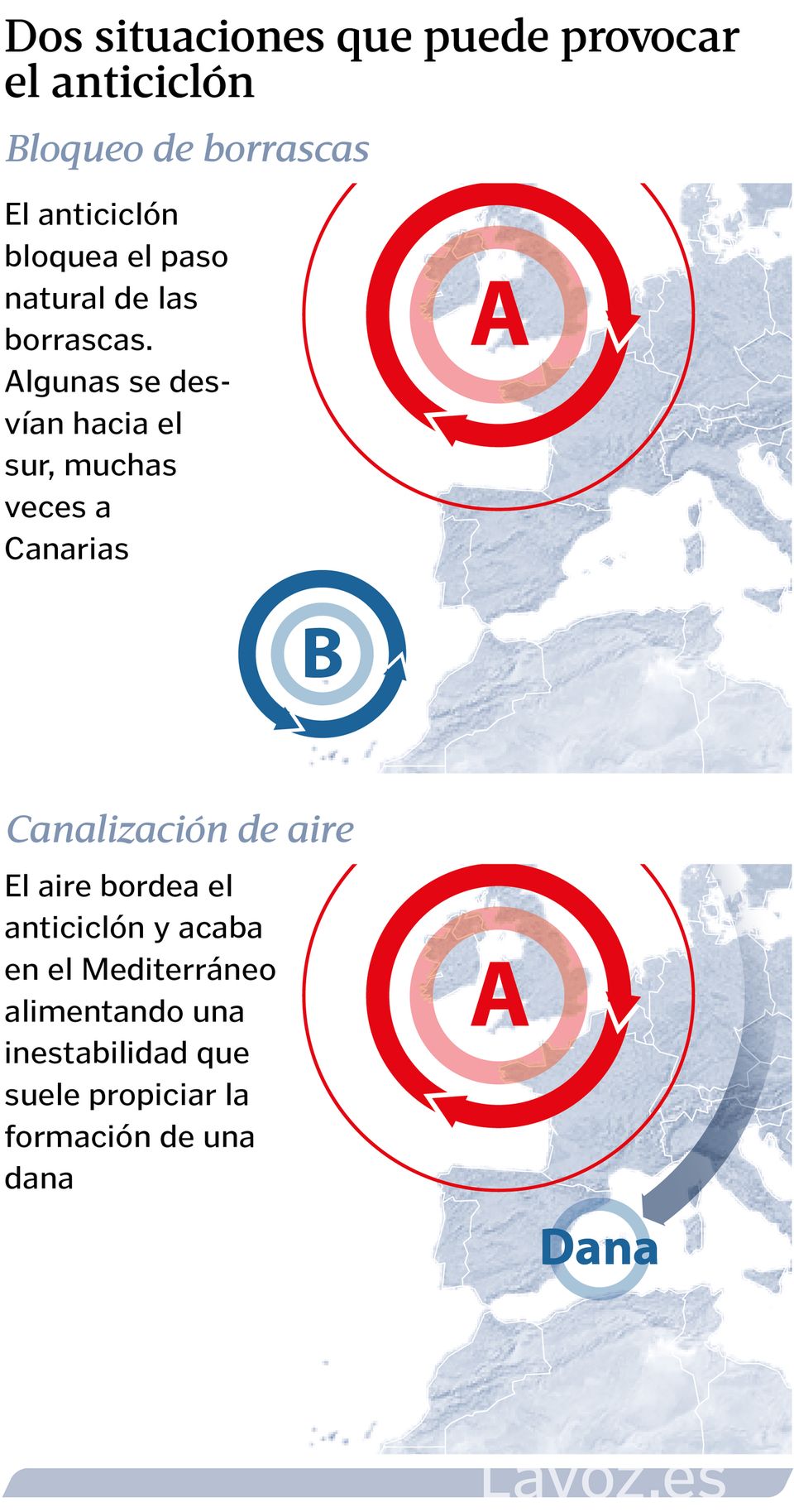 Cuando el anticiclón tiene tanta energía y se sitúa encima del Reino Unido crea una barrera que corta la circulación normal de borrascas. La primera consecuencia es que en el lugar donde más llueve de la Península en una situación habitual, Galicia, desaparece la precipitación. Pero las borrascas tienen que encontrar un camino. A veces lo que hacen es contornear el anticiclón por el sur y acaban en Canarias. Es decir, el tiempo se configura justo al revés de lo que entendemos como natural en este momento del año.