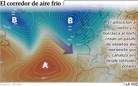 Debido a la ubicación del anticiclón y de la borrasca se creará un corredor de vientos del noroeste a través del cual llegará aire frío desde Groenlandia. Este aire procedente de latitudes polares será el motor de la inestabilidad prevista para las próximas horas.