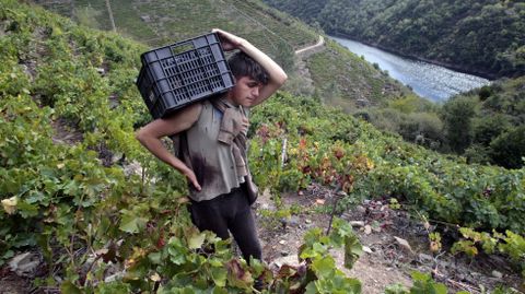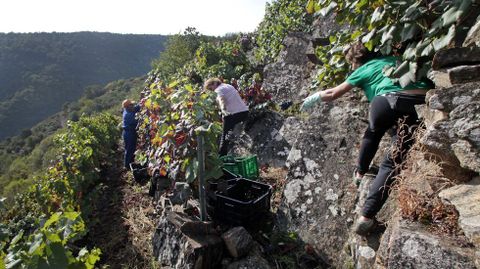 En toda la zona ribereña de esta parroquia de Sober el trabajo en las viñas eran intenso este domingo. Se veía fácilmente por la cantidad de coches aparcados en los márgenes de la carretera que baja hasta el club náutico Ponte do Sil, el embarcadero más concurrido de las rutas fluviales de la Ribeira Sacra. Los abundantes turistas que paraban en el mirador de Soutochao antes de llenar los barcos que recorren el cañón del Sil se fueron con fotos de las viñas con más pendiente de la Ribeira Sacra llenas de vendimiadores.