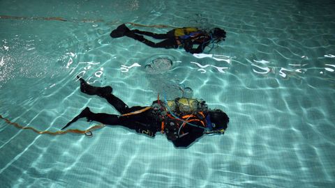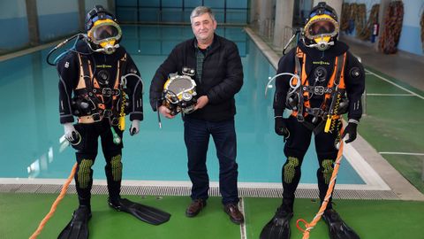La clase de este jueves tocó en la piscina, donde se despliegan cascos, botellas, trajes de neopreno y demás parafernalia que requiere una inmersión. Cada buceador llega a soportar hasta 40 kilos de peso que, aunque en el agua se hacen más livianos, son duros de llevar. En todo caso, las condiciones han mejorado mucho respecto a hace treinta años, cuando Vicente Varela empezó en este mundillo. Ya quisiera él disponer de los medios actuales cuando andaba por Santander, Barcelona o Marsella haciendo obras. Después vendrían trabajos más gratificantes, como el de chequear los fondos de todo el parque de Illas Atlánticas para un estudio sobre la flora y fauna de este espacio natural o cuando iba a la caza de tesoros en los pecios de Rande. En una ocasión, el detector de metales empezó a pitar de tal modo que parecía que en aquel galeón iba a encontrar algo grande; resultaron ser unas simples balas de cañón, pero la esperanza nunca se pierde. «Sempre vas soñando».