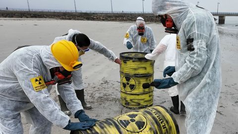 Falsos bidones radiactivos en una playa de Vigo para denunciar los residuos nucleares del Atlántico