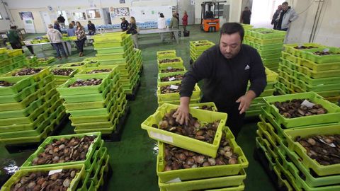 La subasta de la volandeira se realizará el lunes en la lonja de Tragove, que recupera la actividad tras meses de obras. Aunque los trabajos no están finalizados de todo, la venta de marisco puede volver a su sitio.