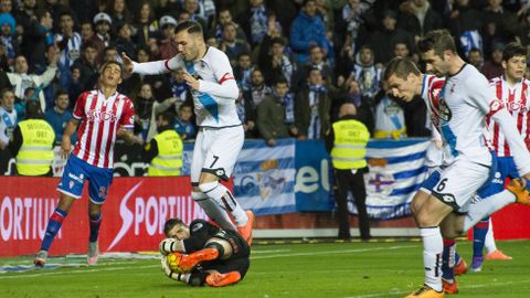 Cada pérdida blanquiazul era un tormento para la zaga porque Jony, Carmona y Sanabria se lanzaban como lobos y su velocidad traía tenebrosos flashbacks del partido de Riazor. El Dépor quería aplicar su plan de presión y robo pero ante el Sporting eso tiene la dificultad de que el rival apenas tiene la pelota en sus pies en zonas donde es peligroso robarla. Así se dibujaba un partido con choques, piques, resbalones y pocas ocasiones. Casi sorprende Fajr con un córner que se le atragantó a Cuéllar, y Cani disparó desde la frontal. Bergantiños, tras perder en el centro del campo, reaccionó para taponar un disparo franco de Rachid. Y Luis Alberto volvía a demostrar su finura de las últimas semanas haciendo equlibrismos sobre la línea de banda y después la de fondo, para un centro sin remate.