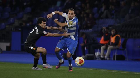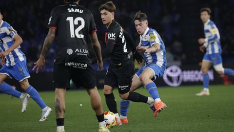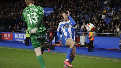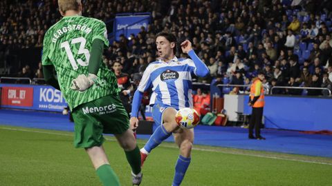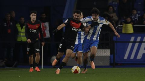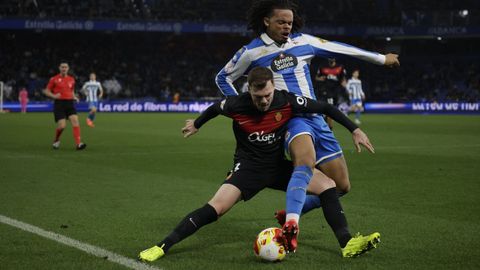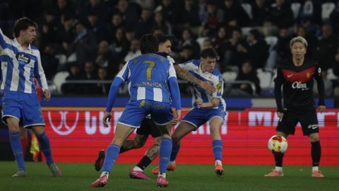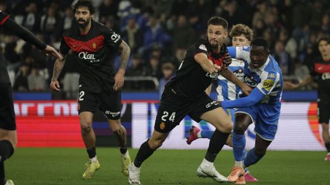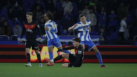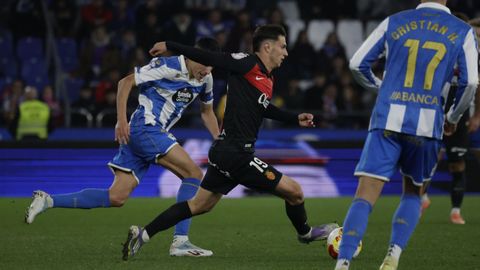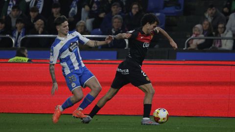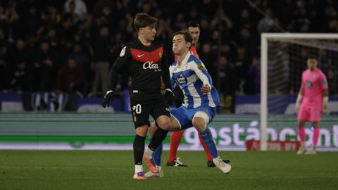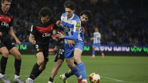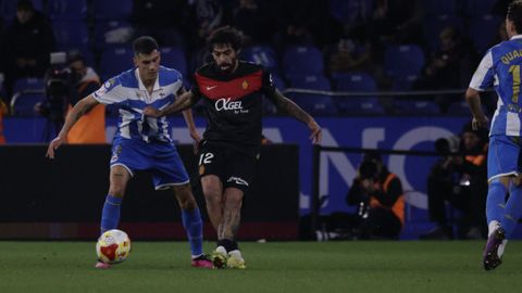 A la primera parte le costó llegar a las áreas. Al Dépor le sobró la prisa, empeñado en resolver en dos toques y por el medio todos sus ataques. Solo cuando evitó ambas situaciones, metió en aprietos a su rival. Conoció el camino desde el principio. A los cinco minutos, la llegada por banda de Quagliata habilitó a Herrera solo en el área, pero este remató flojo a las manos de Bergstrom. Pero lo cierto es que ni el meta del Mallorca ni Puerto trabajaron mucho en los primeros 45 minutos. Hidalgo cortocircuitó la salida del balón de los baleares, que quedaron pendientes de las acciones individuales de Pablo Torre y la movilidad de Samu Costa para romper las líneas blanquiazules.