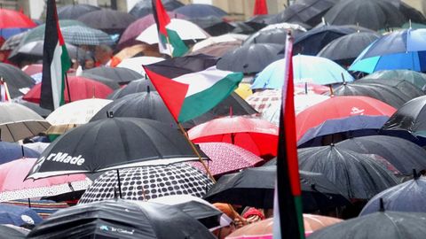 Las numerosas banderas de Palestina no tardaron en compartir altura con miles de paraguas para protegerse de la lluvia que fue a más; pasando de orballo a precipitaciones intensas. A falta de concretar el número de participantes, la organización de la marcha estima que se reunieron unas 40.000 personas. Había gente de todas las edades, sobre todo adultos, y muchos niños y adolescentes que se sumaron a la movilización luciendo cartulinas decoradas por ellos mismos con mensajes pidiendo la paz y el cese de los bombardeos.