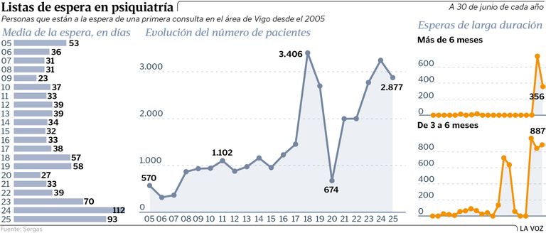 Según los últimos datos oficiales de la lista de espera, el 30 de junio había 2.877 personas esperando una primera consulta en psiquiatría —incluye psicología— en el área sanitaria de Vigo. Es el tercer mayor dato de la historia (a junio). El año pasado había 400 personas más que ahora. «La demanda es ingente», reconoce el Sergas.