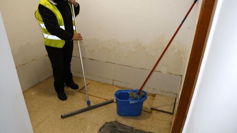 En la planta baja del número 23, una empresa de transporte vive una situación límite. Su responsable explica que el local sufre inundaciones por culpa de los trabajos de construcción en el Barrio do Cura: «El agua se cuela por los azulejos». Se les llena de barro y han tenido que levantar barreras de hormigón en el suelo para contenerlo. Señalan como causa el desvío de los desagües naturales por las obras y advierten de que están perdiendo tiempo y dinero intentando proteger el material almacenado.
