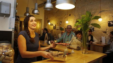 Los tonos blancos y azules de sus mesas exteriores no dejan lugar a dudas sobre la base de su oferta. Nada de su decoración industrial está dejada al azar. Tampoco su carta. Al igual que el resto del local, huye de las complicaciones y se refugia en una sencillez soberbia para preparar su Salmón fresco en aceite de endro, Bocareus do Cantábrico da casa con queixo de cabra, Bacallao afumado con crema de allada, Mexilóns en escabeche da casa o cualquiera de sus quesos gallegos, cecina o embutidos del Bierzo. Se trata de huir de los artificios y simplificar las cosas: Es lo nuestro, lo de toda la vida. Al local de María José Mariño y Ernesto García se va a comer fresco y ligero -todo casero y preparado con mimo y paciencia- y a beber vinos de bodegas denominaciones de origen que no se compran en los supermercados.