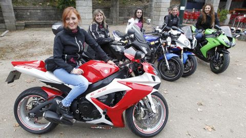 Ella quema mucha más rueda en moto que en coche. De hecho, asegura que el coche «tiene 16 años y 75.000 kilómetros, mi primera moto tenía 6 años y 35.000 kilómetros, y esta que es nueva ya lleva 1.200 en solo un año». Sus dos trayectos más largos, de momento, han sido los que hizo a Madrid y a los Picos de Europa durante cinco días. Y una vez al año, se pega con sus compañeras una ruta solo apta para chicas. Casi todas tienen pareja motera. Ese es el caso de Julia (moto negra), Ana (moto verde) y Ángeles (moto blanca) aunque no el de Iria, que está en el centro con moto azul. Ella lleva casi cuatro años vinculada a este grupo de cañeras. «Empecé con una moto de 125 y ahora ya tengo una de 500. El año que viene me sacaré el carné para coger otra más grande», asegura la chica, que dice que anda en moto desde que era una adolescente: «Hasta me puse a trabajar de camarera para comprarme una moto de 50 con la que andar en ciudad. Llevo media vida subida en la moto».