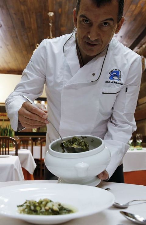 Tal es la pasión que siente por este tipo de comidas que A Taberna celebra todos los años las jornadas de la cuchara, con un menú degustación en el que, no con cantidades muy grandes, el comensal puede comer el mismo día sopa de pescado, fabada, callos, caldereta y caldo gallego. Pero esto será ya en febrero, cuando el cuerpo parezca pedirlo. Respetar el plato clásico es fundamental para el cocinero, por eso en su caldo no faltan los grelos. Aunque en otras ocasiones pruebe, variando la receta ligeramente. «Estamos tan contentos con cómo funciona que seguirá todo el año en la carta. Además, también ofertamos, aunque no todos los días, otros platos de cuchara como fabada o sopa de marisco», afirma.