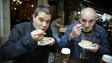 Es un clásico de A Coruña: en A Taberna de Cunqueiro la tapa se toma con cuchara y sabe a crema de verduras. Da igual que sea pleno verano o un invierno de pelarse de frío. «Lo llevamos haciendo desde que abrimos hace nueve años: la gente sabe que si viene aquí con cada consumición servimos un pincho caliente para tomar con cuchara y otros tres pinchos fríos», cuenta Emilio Rey, propietario de este local de la calle de la Estrella con su mujer Cecilia Pérez. La crema de verdura es la estrella, pero si vas allí también te puedes encontrar otras recetas de puchero, como sopa, lentejas o callos los domingos. Hasta sopa de ajo. ¿Y qué tiene la crema de verduras que gusta tanto? «La verdad es que no es una receta cerrada, sino que varía en función de las verduras de temporada. Por eso, a lo mejor si vienes un lunes es más naranja porque lleva mucha zanahoria y si te pasas el miércoles ya es más verde». Se preparan en ollas grandes y al día se despachan unas 30 cuncas. Los fines de semana, cuando no cabe ni un alfiler en la Estrella, las cuncas de crema de verduras se duplican. «No la tenemos dentro de la carta del comedor, pero más de una vez nos pidieron que le sirviésemos una sopera con crema en la mesa», explica Rey. Los mejores críticos gastronómicos de este líquido verde: los niños. «¡Les encanta! No es la primera vez que viene algún padre a la taberna y ese día tenemos de tapa caliente otra cosa en lugar de la crema de verduras y nos dicen ‘¿y ahora qué le damos de comer a los niños?’», asegura.