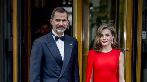 Así se plantó la reina en la cena ofrecida en la que más de uno seguro que no probó bocado del susto. Un vestido de Nina Ricci ?con un pelo efecto mojado? que fue imitado, primero por Diane Kruguer y después por Nicole Kidman. Fue de las primeras en lucir esta tendencia.