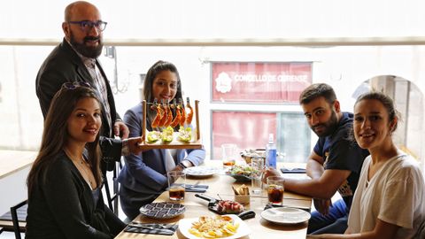 La ubicación del restaurante Tízar, en la plaza de Santa Eufemia de Ourense, es inmejorable, pero esa ventaja no ha sido siempre una garantía de éxito. Parece, sin embargo, que el veterano hostelero ourensano Constantino Iglesias ha conseguido tocar la tecla adecuada con su apuesta por la diversión y la variedad. Es un restaurante dinámico, ágil, con platos divertidos y muy bien presentados. Allí la consigna es pedir varias raciones para compartir entre los comensales. Hay más de una veintena para elegir y el 60 % son aptas para vegetarianos. Tienen especial éxito el tartar de atún y, sobre todo, el «tendal» de langostinos, que se sirve con tres tipos de salsas. Hay, también, según el mercado, mariscos. Constantino Iglesias explica que ha querido que todo tipo de clientela pueda visitar el Tízar y salir bien comido por entre 12 y 15 euros. Pero también hay bocadillos que, con la caña, pueden salir por unos cinco o seis euros. Y, además, hay hamburguesas. Allí se puede ir a comer, a cenar, o a tomar algo entre horas pero, cuidado, los fines de semana es casi imprescindible reservar. Por otra parte, el Tízar ofrece la posibilidad de disfrutar allí de la primera copa. El restaurante, que abrió el pasado mes de agosto, se ha convertido en toda una referencia en la zona de los vinos de la capital ourensana.