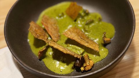 Tras su renuncia a la estrella Michelin, el chef portugués Pedro Pena Bastos pretende acercarse más a su clientela a través de materias primas de pequeños productores, como en el caso de este plato de Setas de temporada, «fricasse» y piel de pollo.