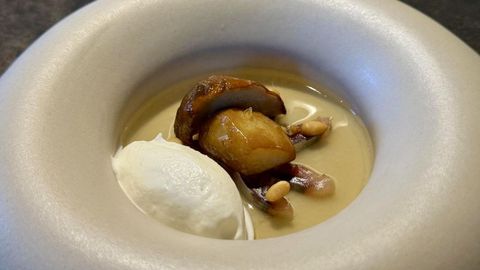 A su vez, la nata ahumada suma cremosidad y notas que realzan el perfume del hongo. Equilibrio preciso entre textura, aroma y salinidad con una presentación sobria y elegante que definen las creaciones de esta joven estrella Michelin.