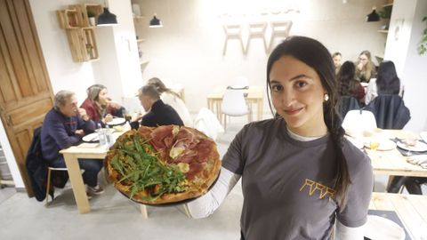 Bajo el lema «no son pizzas, son artesanas», el restaurante Artesa lleva ya siete años alegrando los paladares de ferrolanos y visitantes desde Canido, el barrio alto de la ciudad naval. De la mano de Pablo Santiago, y de sus dos hijos, Inés y Antón, el negocio pegó el estirón hace un par de años, con la ampliación del local. Y sumó un comedor que desde entonces disparó las reservas de grupos grandes. Mientras el más pegado a la puerta, frente a la barra, es ideal para dos, cuatro o seis personas, el nuevo está pensando para grupos de diez, veinte o incluso cuarenta comensales. «Ahora para Navidad es una locura, tenemos muchísimas reservas», comenta Inés, la hija de Pablo, que ejerce de camarera y lleva las redes sociales. «A los amigos les gusta venir en grupo porque Artesa es un sitio muy acogedor, espacioso, con comida rica y a muy buen precio», ensalza Inés. Sus platos estrella son las artesanas, una especie de pizzas preparadas sobre pan gallego —y coronadas con queso San Simón, jamón asado, raxo, verduras o chicharrones, por poner solo algunos ejemplos—, pero también triunfan sus ensaladas variadas y unas tablas de embutidos ideales para compartir.