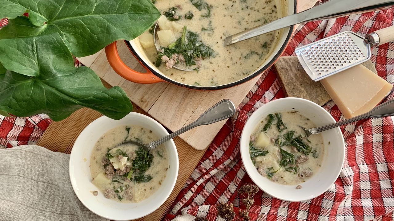 Cuando llega el frío siempre tiramos del recetario de sopas para darnos una alegría al cuerpo. La verdad, es que en nuestro caso, a lo largo de la geografía española la gama de sopas es muy amplia y podríamos fijarnos en las más típicas como la de cocido, la sopa castellana o el caldo gallego. El sabor de esta Sopa Toscanaa podría aproximarse al del caldo gallego pero varía sustancialmente una vez que le ponemos nata y queso. El resultado es muy bueno, distinto a la mayoría de las sopas a las que estamos acostumbrados, pero bien calentita reconforta y sorprende el toque vegetal que le aportan los grelos gallegos. Y es que estamos con una elaboración italiana con productos de kilómetro cero. ¡Mamma mía!