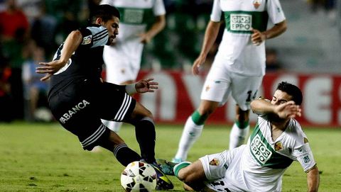 El hijo de Míchel carga sobre Sergio buscando la pelota en el área del Celta. Ahora el Elche con el marcador en contra puede dejar muchos espacios para las ontras locales.