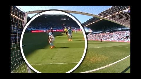 Tras un saque de esquina forzado por Emre Mor. Marca el central, en fuera de juego.