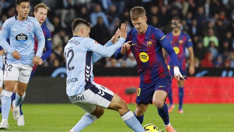 El Barça intentaba penetrar por la banda derecha, pero el goleador del Celta está firme en labores defensivas.